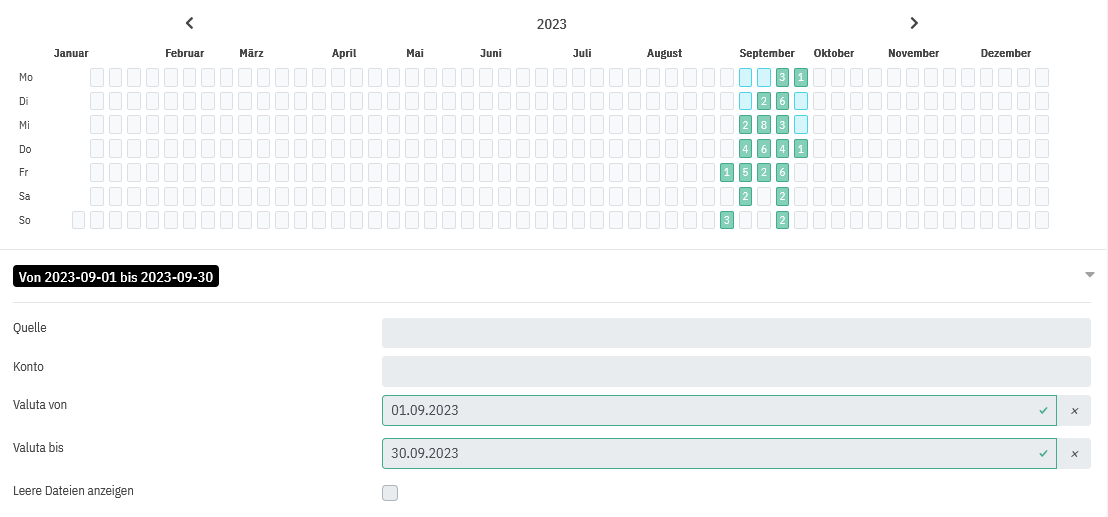 Die CAMT Inbox erlaubt dir deine Dateien nach Valuta, Konto sowie deren Quelle zu filtern. Ebenso kannst du leere Dateien wahlweise ein- oder ausblenden.