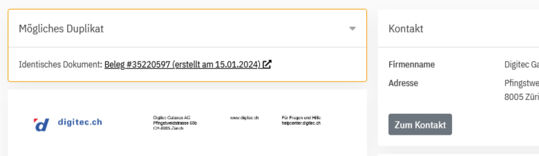 Bisher hat Kontera Duplikate basierend auf der Belegnummer und dem hinterlegten Kontakt erkennt. Neu prüfen wir auch, ob ein anderer Beleg eventuell ein identisches Dokument angehängt hat. Um dir eine genauere Info zu geben wieso ein Beleg ein Duplikat sein könnte, hat die Warnung auch einen neuen Platz oberhalb der Dokumentenvorschau erhalten.